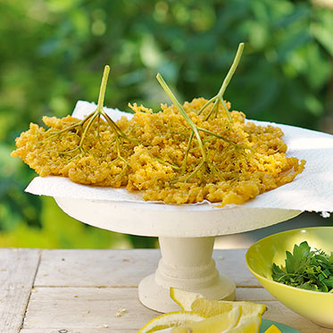 Die gebackenen Holunderblüten heiß und frisch genießen.